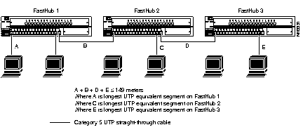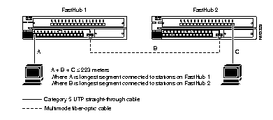 It is possible to increase the distance between two FastHubs by reducing the maximum cable segments connecting stations to the FastHubs. Using Table 3-1, we see that the maximum Cat 5 UTP equivalent distance between any two stations separated by two FastHubs is 223 meters.