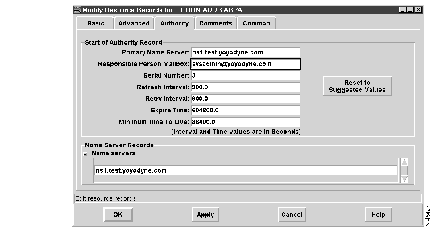 Now that the DNM server contains the zone data for test.yoyodyne.com, admin.yoyodyne.com, sales.yoyodyne.com, and 1.1.10.in-addr.arpa, you can configure the DNS server on ns1 to be authoritative for those domains.