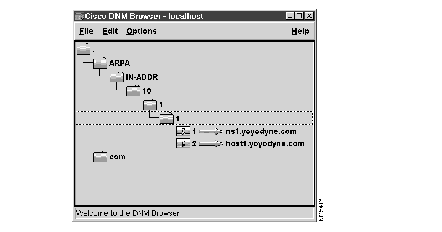Step 15 In the DNM Browser main window, double-click "com," then "yoyodyne," then "dynamic." The "dynamic" domain now includes the domain names of any DHCP clients that have obtained leases from the DHCP/BootP server.