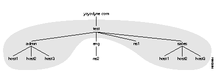 The example zone files come from a name server, ns1.test.yoyodyne.com, which is configured as a primary name server for the domain, test.yoyodyne.com, and two subdomains, admin.test.yoyodyne.com and sales.test.yoyodyne.com. ns1 is also configured as a secondary name server for the domain eng.test.yoyodyne.com, for which ns2.eng.test.yoyodyne.com is primary. The grey area in the following figure represents the zones for which ns1 is authoritative.
