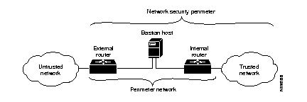 - In rarer cases, bastion hosts are used as one of three components to construct a firewall system--the component that inspects network traffic at protocol layers above the Internet layer. The remaining two components are routers: one known as the internal router (separating the perimeter network from the internal network) and the other known as the external router (separating the perimeter network from the external, or untrusted network). Because bastion hosts only contain one network interface card, this computer cannot protect itself against IP spoofing attacks. Therefore, to prevent IP spoofing, the bastion host must be positioned between two routers; one router filters all requests from untrusted networks and the other filters all requests from the trusted networks to ensure that no spoofed packets reach the bastion host. These routers also verify that all network traffic that passes between them is addressed to the bastion host only. Figure C-1 depicts a firewall system that is constructed using a bastion host and two routers.