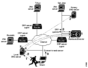 Using the Director Response Protocol (DRP), a simple User Datagram Protocol (UDP)-based application developed by Cisco, the Director can query properly configured Cisco routers in the field for Exterior Gateway Protocol (EGP) and Internal Gateway Protocol (IGP) topological "distance" metrics. With this information and other configuration metrics, the Director can assign an optimal distributed server to each client. As a result, users can be transparently and automatically assigned a distributed server anywhere on the Internet.