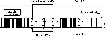 Figure A-1 shows the network activity, health, run, and power LEDs on the front panel of the Director.