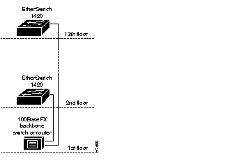 Figure 3-7 shows an EtherSwitch 1420 connected to several 100BaseT servers. The EtherSwitch 1420 has a 4-port shared 100BaseFX module and a switched 100BaseFX module. The servers in building 2 are configured with 100BaseFX adapters.