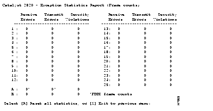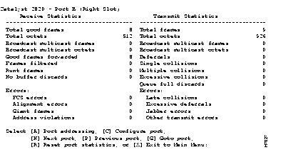 This report displays the frame-count statistics generated by the Catalyst 2820 and 1900. Display this report, shown in Figure 5-29, by pressing U on the Main Menu and U on the Usage Summary Menu.