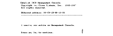 If you are using firmware with a boot version lower than 1.09, call Cisco Systems with the Ethernet address displayed on the Management Console Logon screen. You will be issued the factory-installed password for your switch. Use this password to enter the system, and then change the password using the Console Password Menu option M.