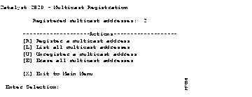 [U] Use of store-and-forward for multicast. The store-and-forward switching mode is always used for broadcast frames. Enable this option to force store-and-forward mode for multicast frames. With this option set to disabled, multicast frames adhere to the switch's configured switching mode. Enter E or D and press Return.