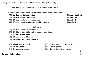 [F] Reset with factory defaults. Use this option to reset the switch and return it to its factory settings. All static and dynamic addresses are removed, as is the IP address and all other configuration parameters. Enter Y or N and press Return.