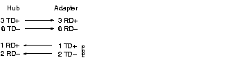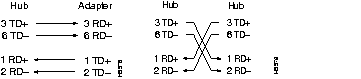 Ports 1 through 25 use standard RJ-45 connectors and 10BaseT pinouts with internal crossovers, as indicated by an X. These 10BaseT ports have their transmit (TD) and receive (RD) signals internally crossed for attachment of an adapter using a straight-through cable. Figure A-1 shows the connector and the pinout.