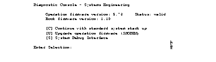 [C] Continue with standard system start up. Select this option after you have resolved the firmware problems with options [U] or [S]. It brings up the firmware as usual.