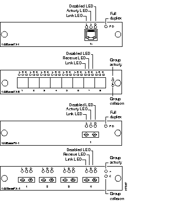 The 100BaseT modules have individual port and group-status LEDs and a full-duplex LED. These LEDs are shown in Figure 1-2 and are described in the following sections.