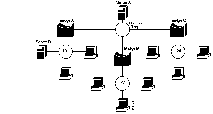 In Figure B-1, bridges B and C that connect local rings to the backbone ring reduce the performance of rings 123 and 024 that access Server A. Further problems may be introduced by aggregate traffic loading on the backbone ring.