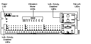 The Catalyst 1700 has an extensive range of LEDs that allow easy and fast troubleshooting. The Catalyst 1700 has a Power LED, Utilization Meter LEDs, Status LEDs, and Network LEDs. These LEDs are shown in Figure 1-6 and described in the following sections.