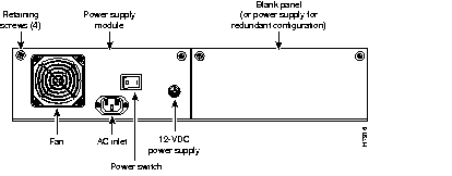 You must access the power subsystem from the rear of the chassis. The rear of the chassis has two identical slots, each of which can hold one power supply. If you are viewing the Catalyst 1800 switch from the rear, as it is shown in Figure 1-2, then power supply A is on the left and power supply B is on the right. All power supplies are identical and can be installed in either slot.