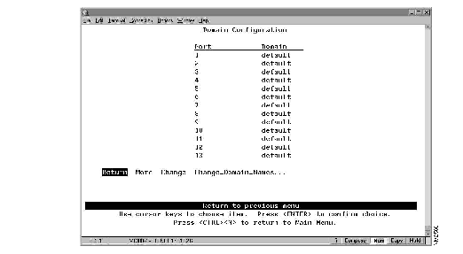 To view the current port assignments or to assign the ports of the Catalyst 2600 to different domains, select Domain Configuration on the Configuration Menu. The Domain Configuration panel (Figure 5-3) is displayed.