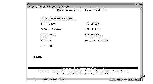 To view or change IP information associated with a domain, such as the IP address, subnet mask, or IP state, or to send PINGs, select IP Configuration on the Configuration Menu. The IP Configuration panel (Figure 5-5) is displayed.