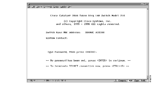 After you have established a connection to the Catalyst 2600 via either a serial link or a Telnet session, the Copyright Panel (Figure 4-1) is displayed.