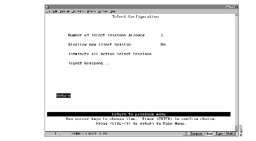 Note You cannot select Number of Telnet Sessions Allowed, Disallow New Telnet Sessions, or Terminate All Active Telnet Sessions if you are accessing the configuration program via Telnet.