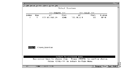 To display information about or close any active Telnet session, select Telnet Sessions from the Telnet Configuration panel. The Telnet Sessions panel (Figure 4-5) is displayed.