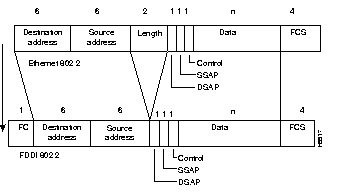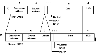 An Ethernet 802.2 frame is translated into an FDDI 802.2 frame as shown in Figure C-7. When an Ethernet 802.2 frame is received, the FC field is added to the FDDI frame, and the Length field is stripped. Any padding in the Ethernet Data field is dropped.