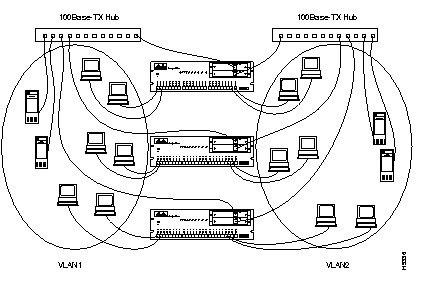 VLANs spanning multiple Catalyst 2800s require a dedicated port on each switch for each VLAN interconnection. The configuration in Figure 3-3 shows two VLANs spanning multiple Catalyst 2800s. In this example, ports F1 and F2 on each Catalyst 2800 provide the link to interconnect VLAN1 and VLAN2, respectively. An external 100Base-T hub (or FDDI concentrator) then connects each link to form the overall VLAN. If one or more of the switched 100Base-T ports on the Catalyst 2800 are used for other connections, or if more than two VLANs span multiple Catalyst 2800s, then a dedicated 10Base-T port on each switch is required to interconnect the VLAN.