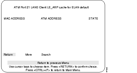 This menu is accessed from the ATM LANE Client ELAN Table menu. This menu provides information on the LE_ARP Cache for default ELAN.