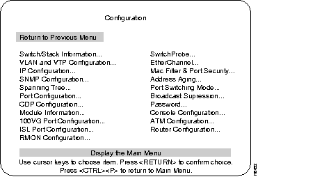 The Configuration menu enables you to view and set the Catalyst 3200 configuration parameters. The following section describes the Configuration menu and its sub-menus.