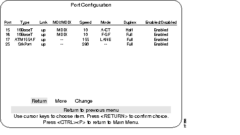 Step 2 From the Configuration main menu, choose Port Configuration. From this menu display, choose "More" to display information for ports 17 and 21. Verify that the status fields associated with it are similar to the example screen shown below (except for MDI/MDIX).