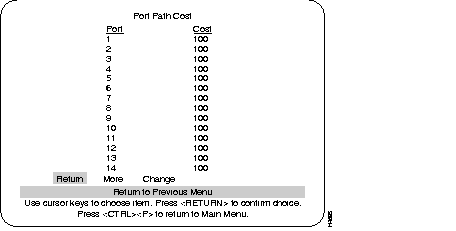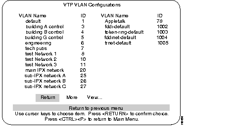 The following menu, VTP VLAN Configuration, is accessed from the VLAN and VTP Configuration menu. When the switch is in the Server mode, the menu displayed below is presented. The line after the VLAN Name parameters will read "Return More Change... Add... Delete."