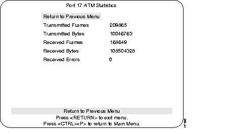 This menu lists the number of frames and bytes that have been transmitted and received per the selected ATM port (17 or 21). The last line displays the number of received errors for that port.
