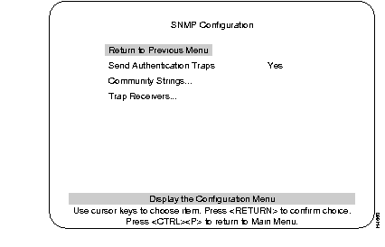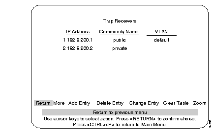 Trap Receiver Table entries are saved when you select Return to Previous Menu. Entries are preserved across resets and power cycles.