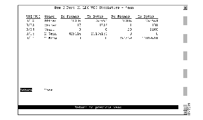 To view VCC statistics for this LEC, select LEC VCC Statistics on the Port x LEC Statistics Menu panel. The Port x LEC VCC Statistics panel (Figure 29) is displayed.