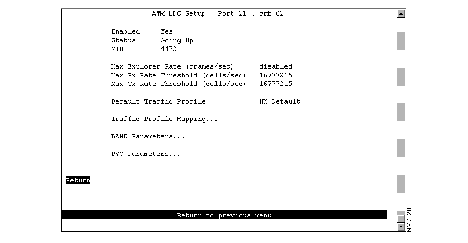 The Catalyst 3900 allows you to define up to 64 traffic profiles. These profiles can be used to define the maximum rates for each traffic type. The traffic profiles are defined on the Traffic Profile Table Setup panel. Refer to "Configuring Traffic Profiles Tables" in the "Configuring the ATM Expansion Module"section for more information.