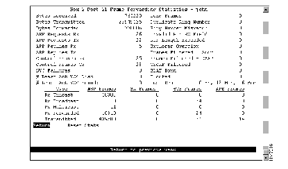 To view forwarding statistics about frames received and transmitted on this port, select Frame Forwarding Statistics on the Port x LEC Statistics Menu panel. The Frame Forwarding Statistics panel (Figure 24) is displayed.