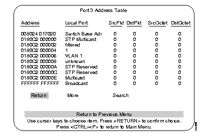 The Master Address Table contains MAC addresses of all ports known to the Catalyst 3000. The table can contain up to 6,000 entries with standard memory or up to 10,000 with optional expanded memory.