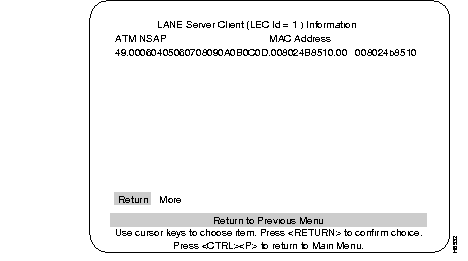 Selecting Client's Info at the LANE Server/BUS Configuration menu takes you to the LANE Server Client Information menu. This menu displays the LANE Server Client information.