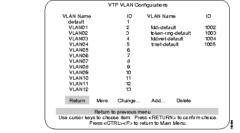 Step 7 When you are finished defining new VLAN names, select the return option to return to the VTP and VLAN sub-menu.