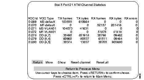 The following are examples of ATM Statistics menus with various types of information. Explanations of the different types of VCCs follow these menus. For a complete explanation of Statistic menus see the Catalyst 3000 series Installation and Configuration Guide.