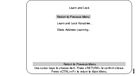 Step 5 Return to the Learn and Lock menu and select the heading Static Address Learning. In the following Static Address Learning menu example: