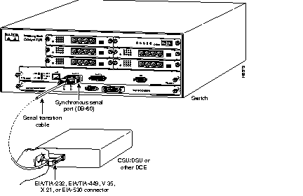 The synchronous serial port supports the following signaling standards: EIA/TIA-232, EIA/TIA-449, V.35, X.21, and EIA-530. You can order a DB-60 shielded serial transition cable that has the appropriate connector for the standard you specify. The router end of the shielded serial transition cable has a DB-60 connector, which connects to the serial port on the router card. The other end of the serial transition cable is available with the connector appropriate for the standard you specify. The documentation for the device you want to connect should indicate the standard used for that device. The synchronous serial port can be configured as DTE or DCE (except EIA-530, which is DTE only), depending on the attached cable.