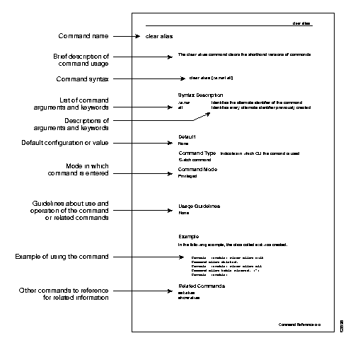The following illustration explains the fields on a typical command reference page: