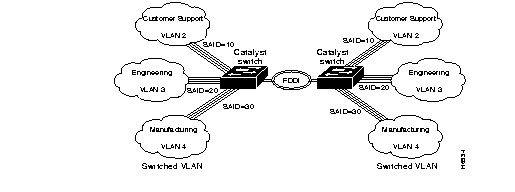 Refer to Figure 1-11 for an example of configuring FDDI trunks. In this example, the SAID ensures that packets destined for VLAN 1 only reach VLAN 1 after they are transmitted across the FDDI trunks. Refer to Figure 1-12 for an example of an FDDI 802.10 VLAN network configuration.