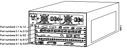In the Catalyst 5000 switch, physical port addresses specify the actual physical location of each module port on the rear of the switch. (See Figure 1-46.) The address is composed of a two-part number in the format slot/port number. The first number identifies the slot in which the module is installed. Module slots are numbered 1 to 5 from top to bottom. The second number identifies the physical port number on the module. The port numbers always begin at 1 and are numbered from the left port to right port, facing the rear of the switch. The number of additional ports (n/1, n/2, and so on) depends on the number of ports available on the module.
