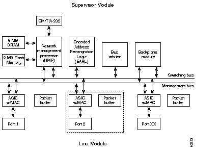 The Catalyst 5000 architecture is based on high-speed switching network principles, using a queuing model for input and output. Each Catalyst 5000 port maintains its own frame buffer memory. Each frame is stored in a frame buffer before it is forwarded to the next port.
