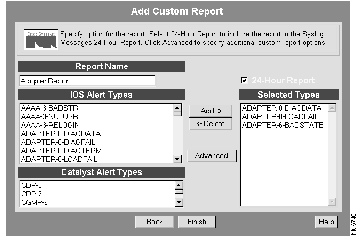 Step 5 Select the alerts you want reported from the Cisco IOS Alert Types and Catalyst Alert Types lists. Click Add after each selection. The selected alerts appear in the Selected Types list.