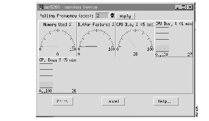 CiscoView displays performance information using the Monitor menu on the main window, or by selecting Monitor from a component popup menu. Performance information is displayed in a dashboard made up of a collection of small graphical displays in one window. For more information on the dashboard monitor, see Using the Dashboard Monitor, later in this chapter.