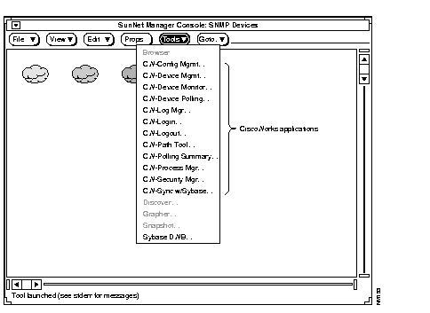 Figure 4-1 shows the Tools menu with both SNM tools and CiscoWorks applications. Except for Browser, Discover, Grapher, and Snapshot, all others are CiscoWorks applications.