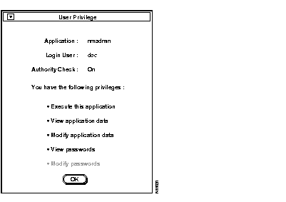 The Privilege command allows you to check your user privileges. When you select the Privilege command, the User Privilege window appears. See Figure 2-5.