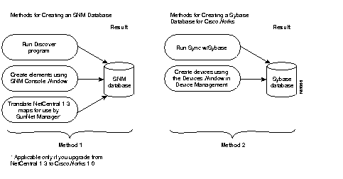 Figure 2-8 illustrates the differences between database creation in SNM and in CiscoWorks. Method 1 represents the three options you have to create an SNM database. Method 2 represents the two options you have to create a Sybase database for CiscoWorks.