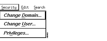 The Security menu, shown in Figure 1-17, appears in the windows of CiscoWorks applications that use authentication-checking, a feature that allows an administrator to grant different levels of access privileges to CiscoWorks applications. Depending on whether the application governs a process or database function, you can use the menu commands to access another domain, to log in as another user, or learn what user privileges you have for a given CiscoWorks application.